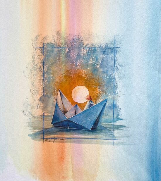 Aquarell - Papierboot mit Person