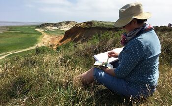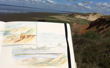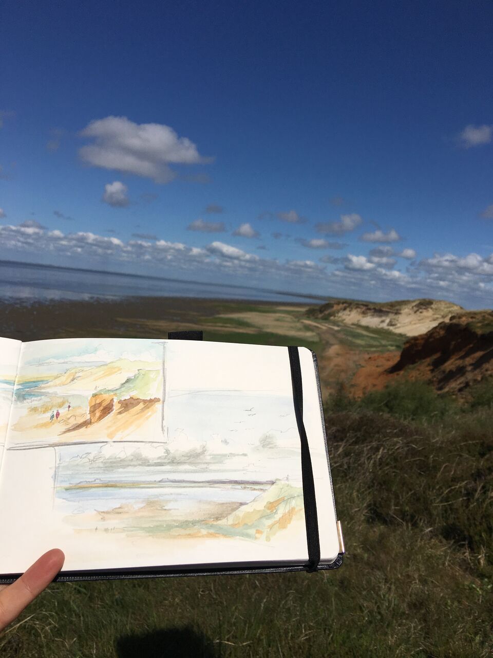Welche Strichführung hilft, um das Charakteristische der Insel Sylt zu erkennen? Wie spiele ich mit Kontrasten, um die Stofflichkeit meines Motivs herauszuarbeiten? Wie bringe ich Bewegung und Perspektive in Meeresansichten und Himmel? Die kleinen, schnellen Zeichnungen direkt am Meer helfen zu verstehen. Es macht viel Freude, live draußen zu malen. - Himmel, Meer und Kliffs